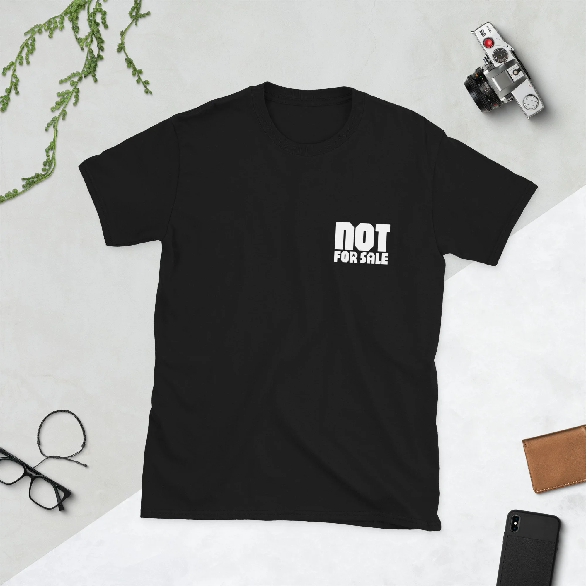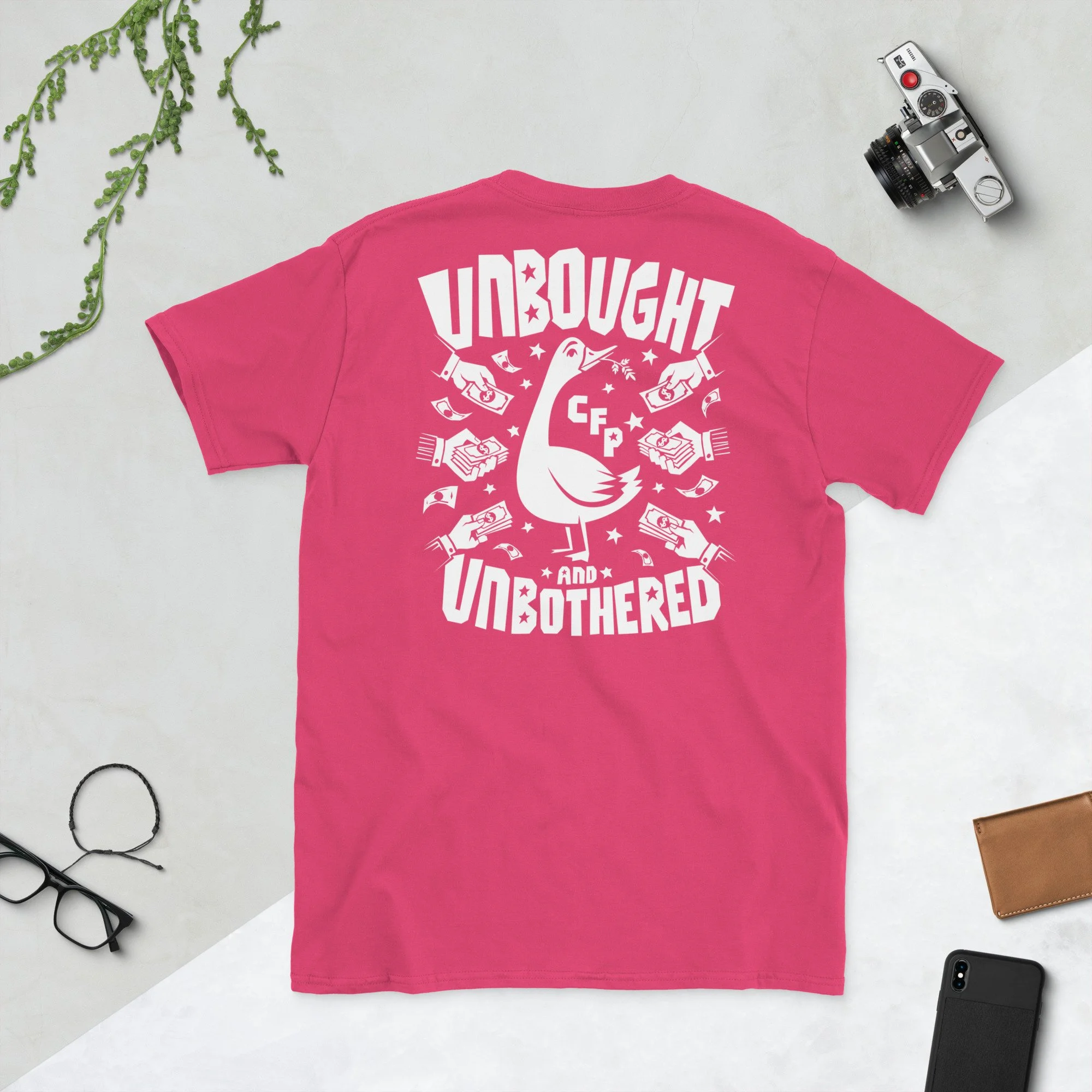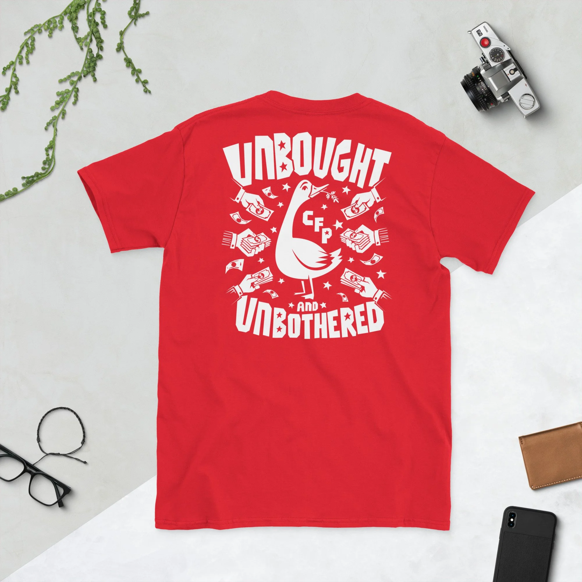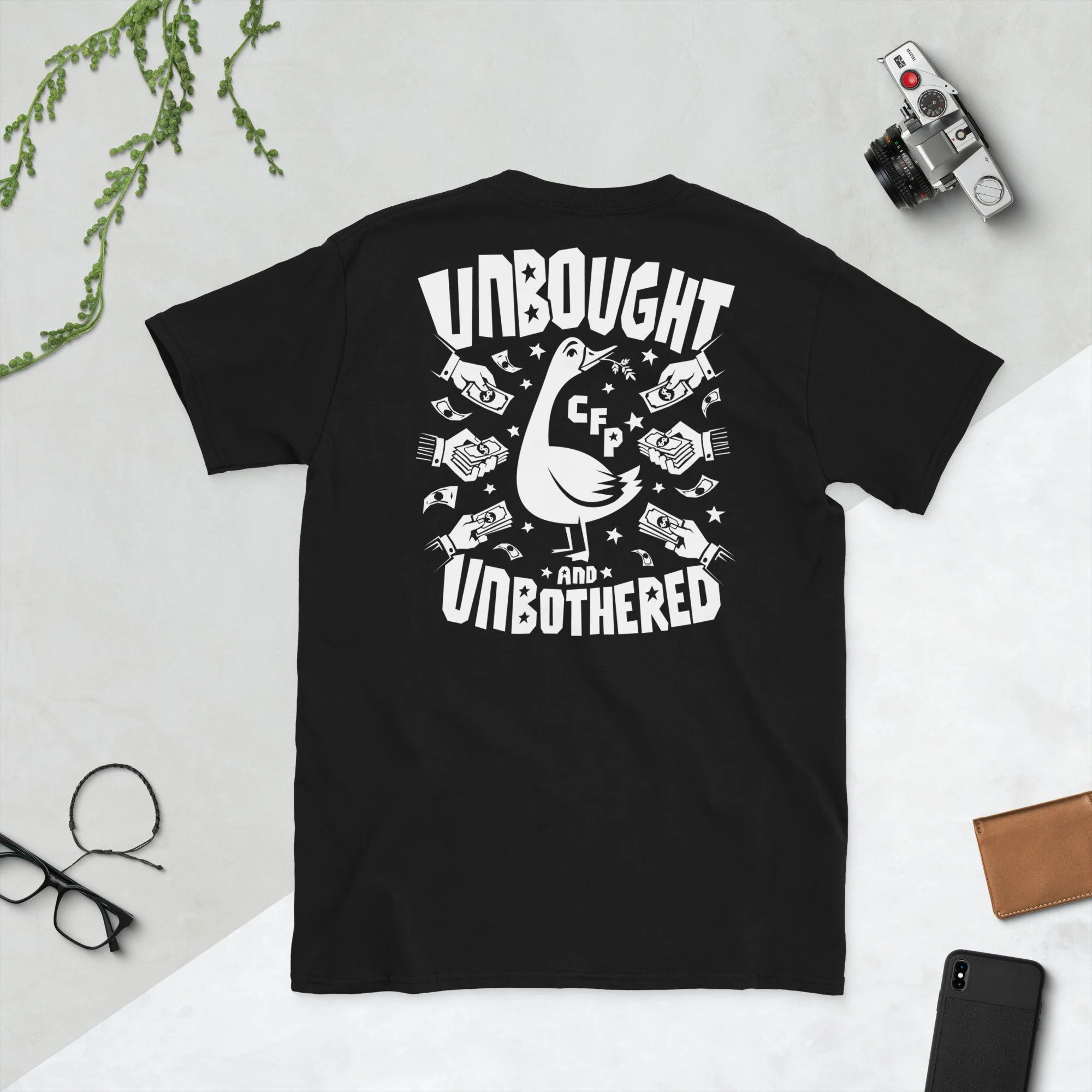 Unbought and Unbothered (double sided) Short-Sleeve Unisex T-Shirt. Your purchase of this tee, helps support the Community First Party! CFParty.org. This versions features 'NOT FOR SALE' on the front and the full 'UNBOUGHT AND UNBOTHERED' graphic on the back.